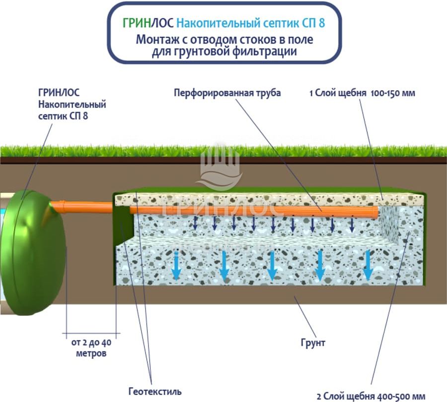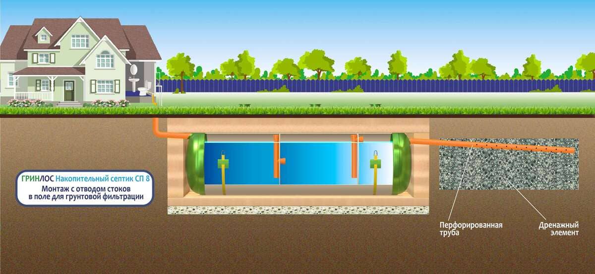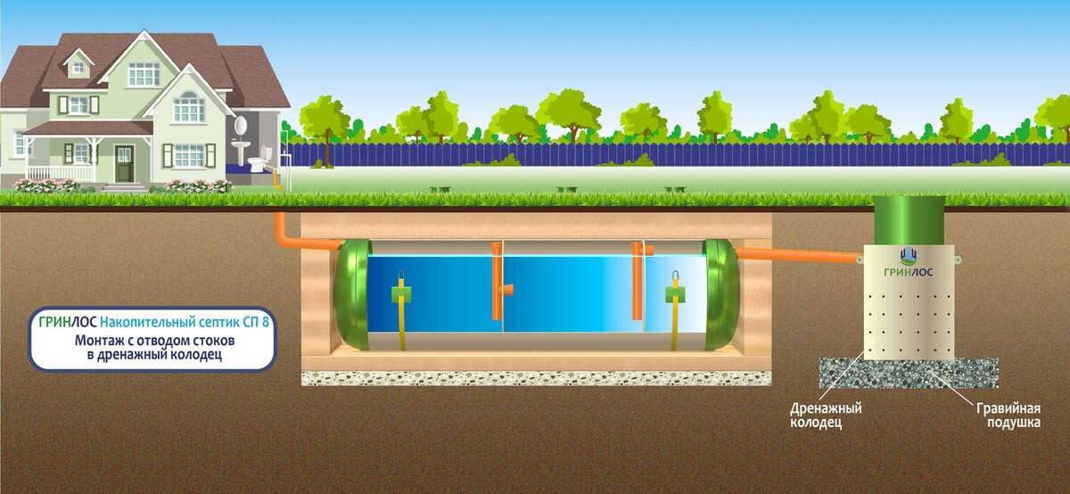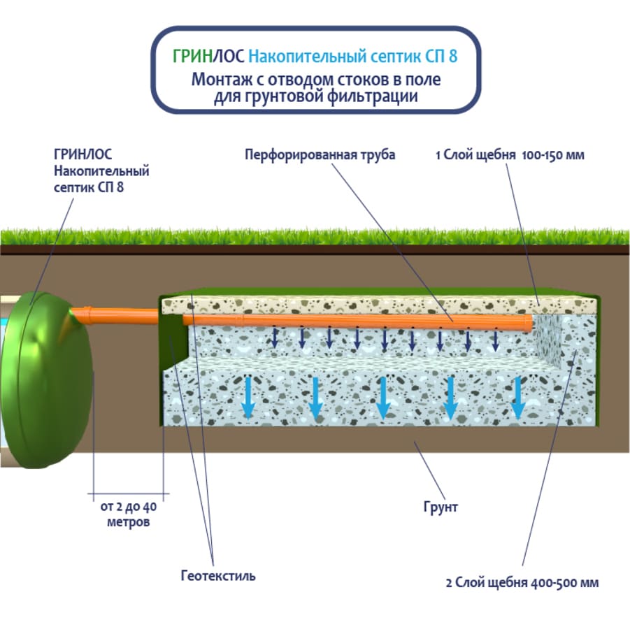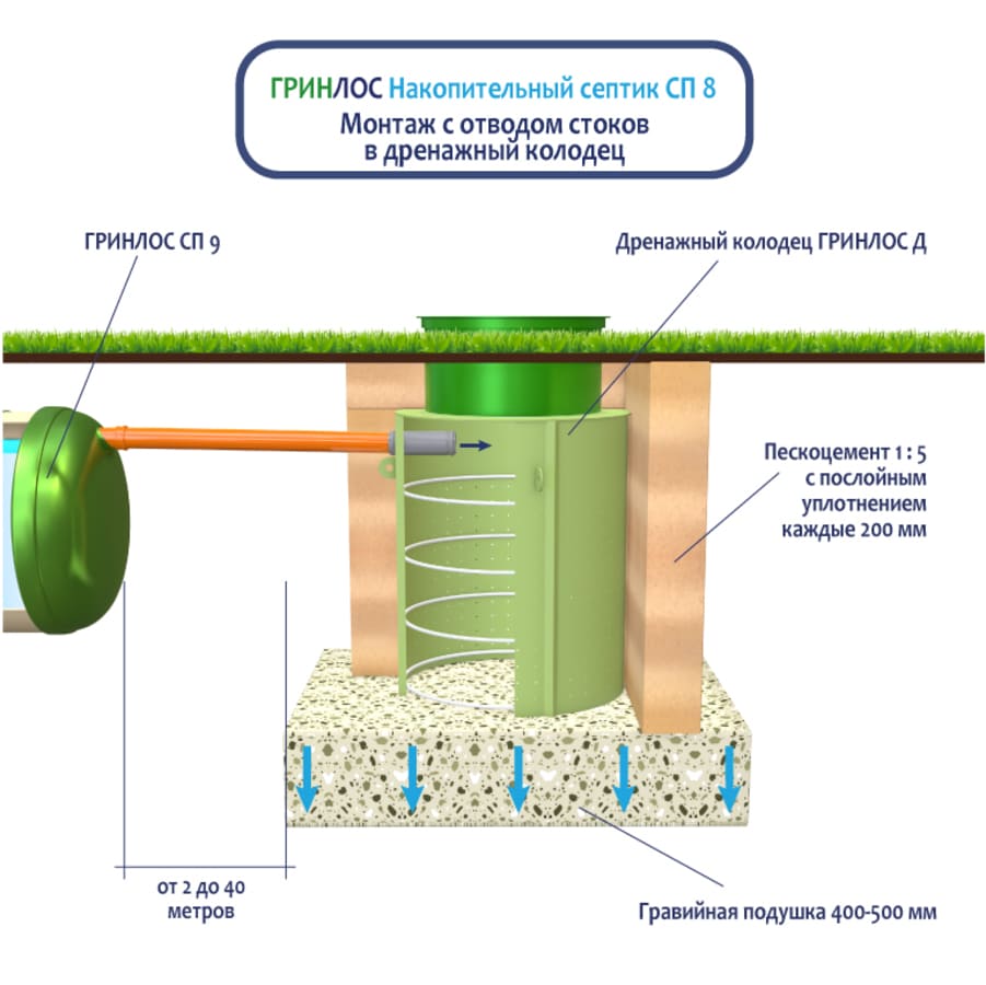 Монтаж с отводом очищенных сточных вод в дренажный колодец. Подходит для хорошо поглощающих грунтов (песок, супесь) и низком уровне грунтовых вод. Колодец поглощения может быть выполнен из бетонных колец или при помощи пластикового колодца с перфорированным основанием и стенками. При монтаже колодца поглощения на выпуск трубы рекомендуется смонтировать обратный клапан для защиты Накопительного септика Гринлос СП 8 от обратного затопления в периоды активного снеготаяния или в дождливое межсезонье. Непосредственно под выпуском отводящей трубы от септика рекомендуется смонтировать аварийный насос для дополнительной защиты Накопительный Гринлос СП 8 от обратного затопления из колодца поглощения.