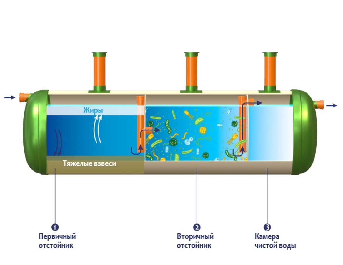 По канализационной трубе от дома сточные воды поступают в первый бак или отсек (первичный отстойник).