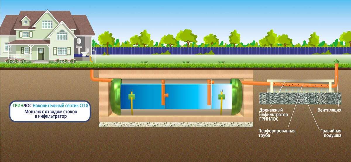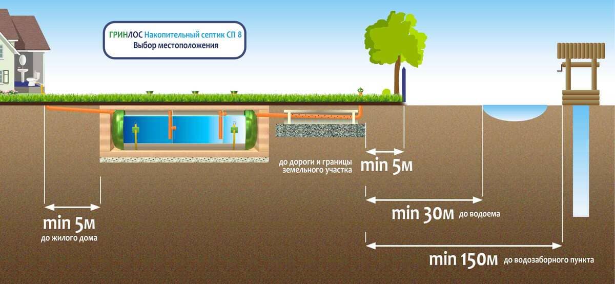 При планировке участка для канализационной системы с накопительным септиком ГРИНЛОС СП 8 следует учитывать следующие рекомендации:
