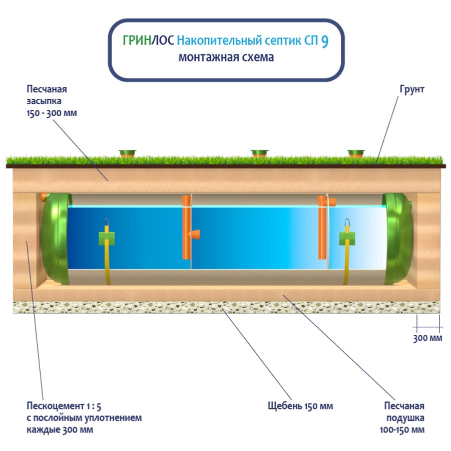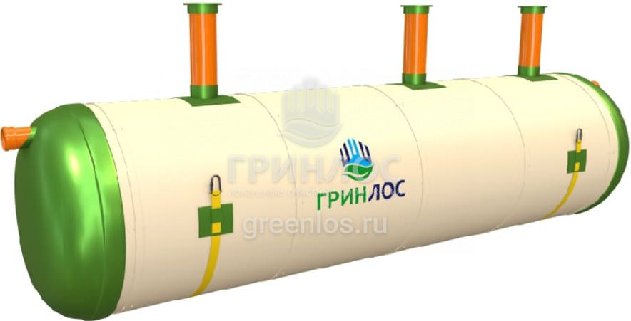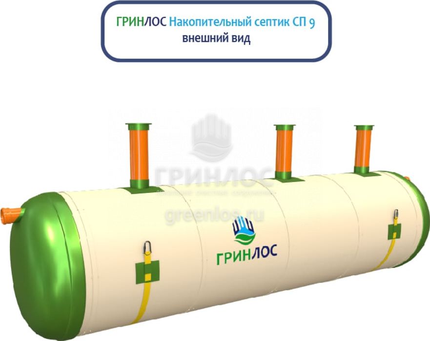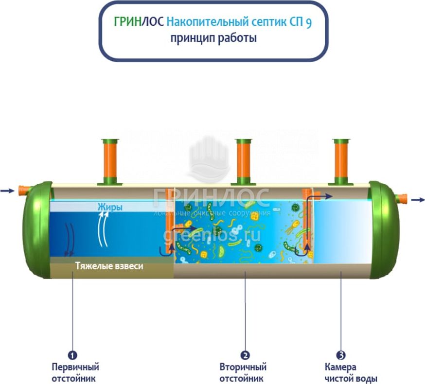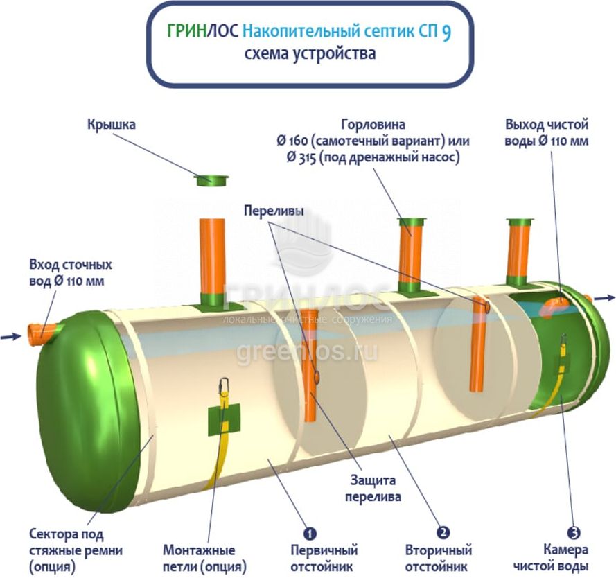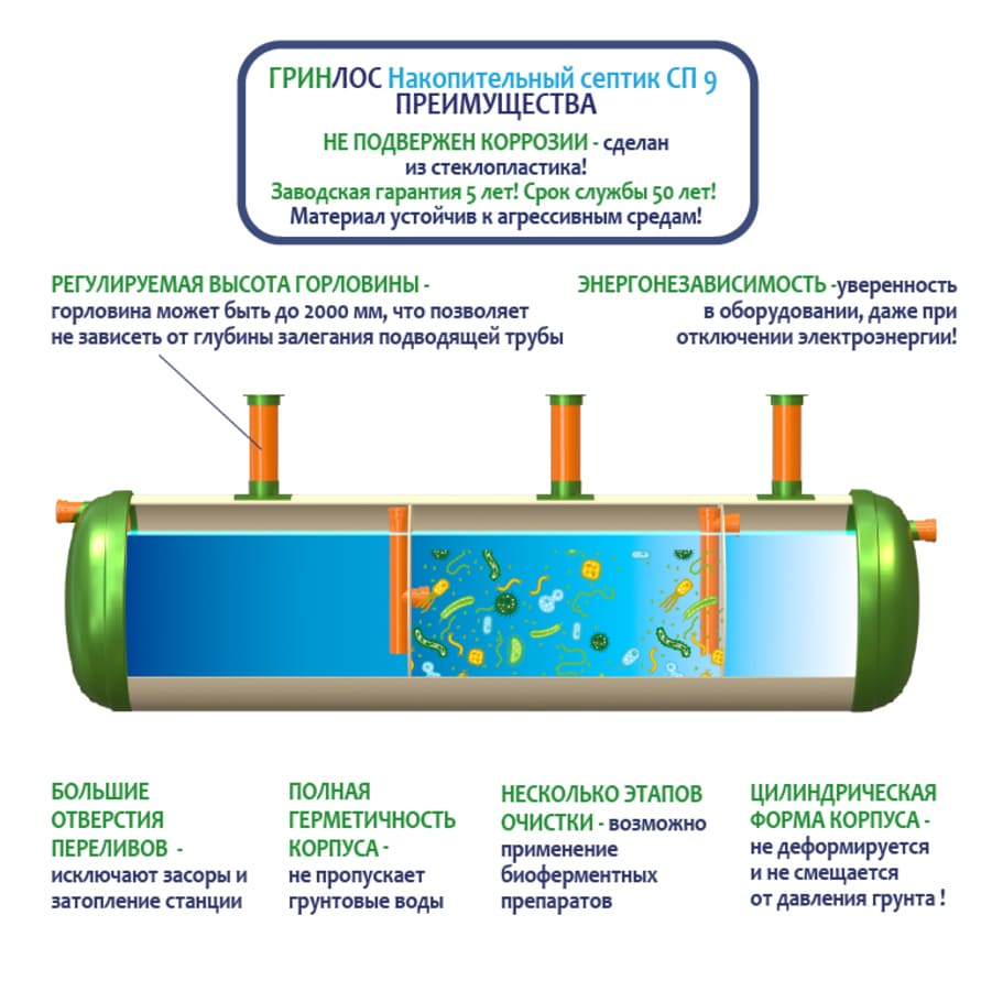 Конструкция Накопительный Гринлос СП 9 представляет собой цилиндр, выполненный из стеклопластика. Внутри цилиндр с помощью перегородок разделен на камеры, сообщающиеся между собой через отверстия для перелива.