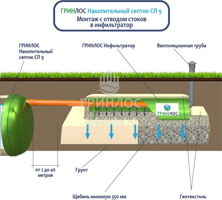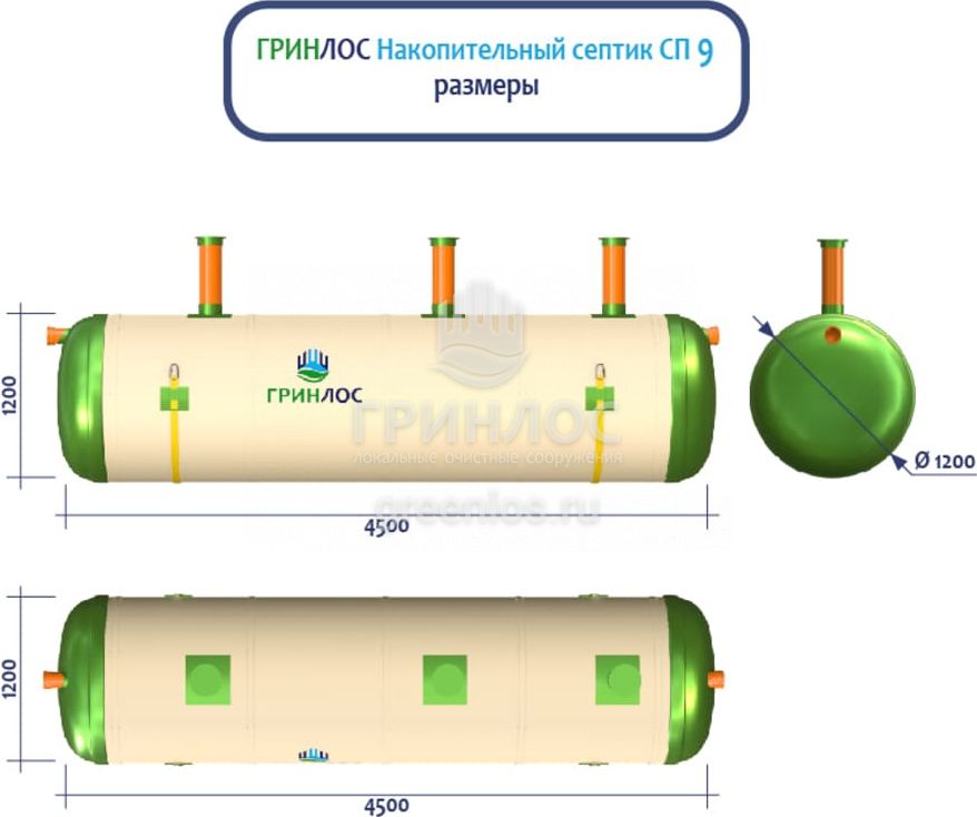 Накопительный септик ГРИНЛОС СП 9 — это энергонезависимый септик с залповым сбросом 360 л и производительностью 1.8 м3/сутки, что делает его подходящим для домов, в которых число жильцов не превышает 9 условных пользователей.