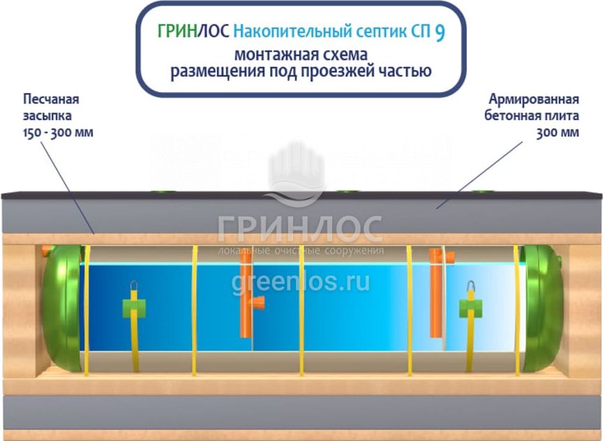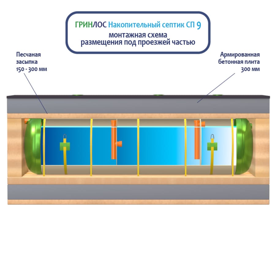 Накопительный Гринлос СП 9 - энергонезависимый септик накопительного типа, поэтому его следует располагать на участке так, чтобы к нему мог беспрепятственно подъехать ассенизационный автомобиль. Над местом установки Накопительного септика СП 9 не допускается движение и стоянка автотранспорта в радиусе 2,5 м. В случае необходимости проезда автотранспорта или организации стоянки, над очистным сооружением и над подводящей и отводящей трассами следует оборудовать разгрузочную плиту.