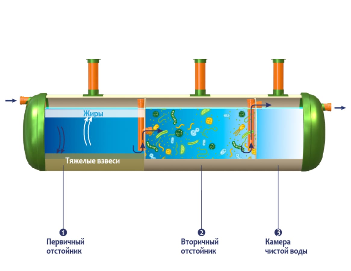По канализационной трубе от дома сточные воды поступают в первый бак или отсек (первичный отстойник).