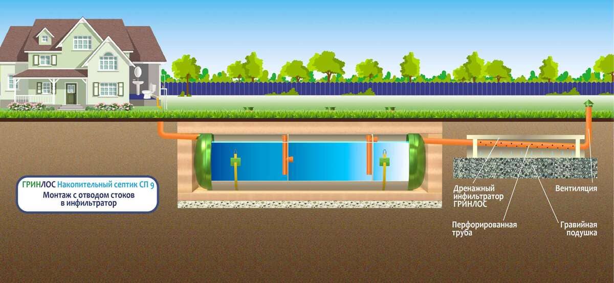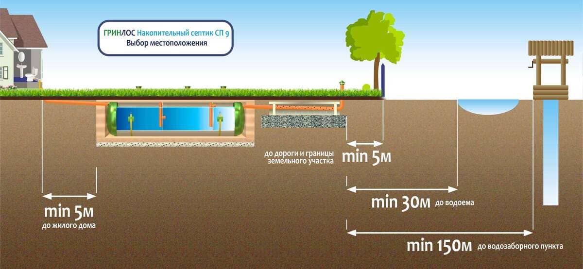 При планировке участка для канализационной системы с накопительным септиком ГРИНЛОС СП 9 следует учитывать следующие рекомендации: