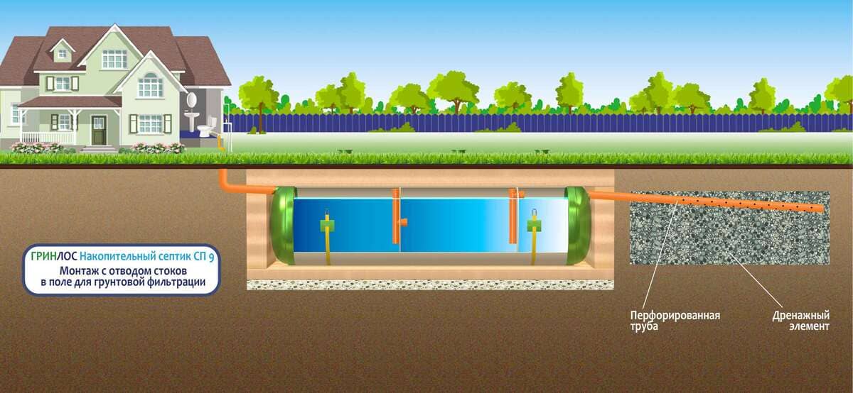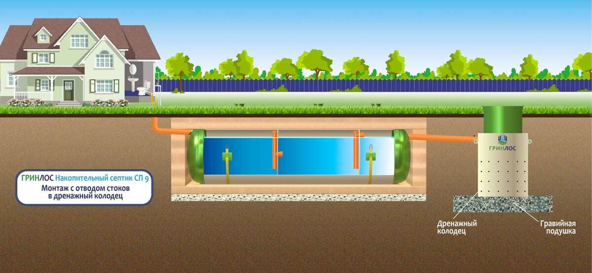 Монтаж с отводом очищенных сточных вод в дренажный колодец. Подходит для хорошо поглощающих грунтов (песок, супесь) и низком уровне грунтовых вод. Колодец поглощения может быть выполнен из бетонных колец или при помощи пластикового колодца с перфорированным основанием и стенками. При монтаже колодца поглощения на выпуск трубы рекомендуется смонтировать обратный клапан для защиты Накопительного септика Гринлос СП 9 от обратного затопления в периоды активного снеготаяния или в дождливое межсезонье. Непосредственно под выпуском отводящей трубы от септика рекомендуется смонтировать аварийный насос для дополнительной защиты Накопительный Гринлос СП 9 от обратного затопления из колодца поглощения.