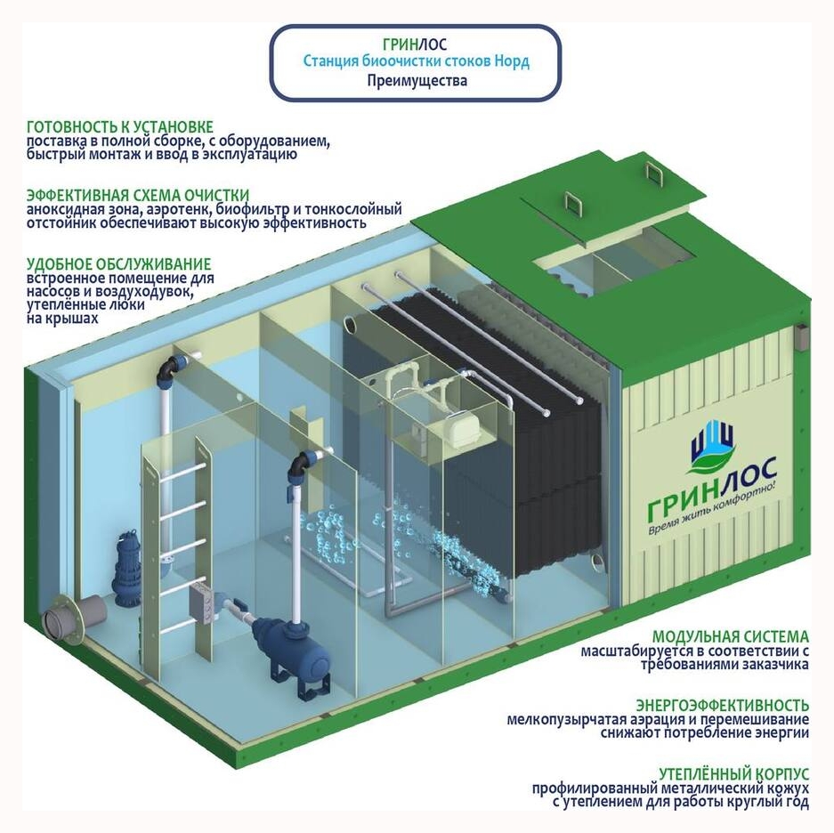Аноксидная зона, биофильтр, аэротенк и тонкослойный отстойник обеспечивают высокую эффективность.