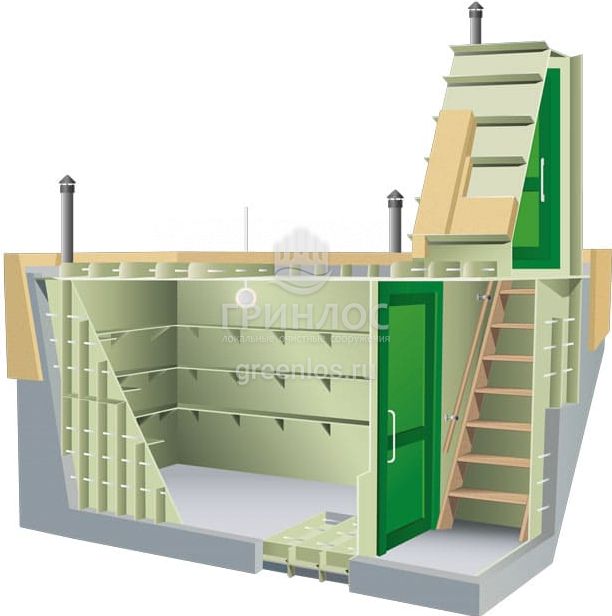 Для функциональной эксплуатации Гринлос Погреб ДТБ 4500*2000*2000 оборудован приточной и вытяжной вентиляцией, освещением, полками, лестницей, дверью.