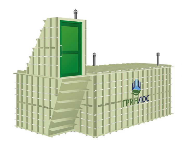 «ГРИНЛОС Погреб» представляет собой герметичное техническое помещение габаритами 4.5x2x2 м, предназначенное для заглубления в землю. Для удобства и простоты доступа внутрь, вход выполнен вертикально и представляет собой коридор с лестницей. Размеры погреба со входом составляют 5.5x2x3.7 м. Для дополнительной защиты от промерзания имеется возможность установки второй двери. Погреб поставляется в полной заводской готовности для круглогодичного хранения продуктов питания – овощей, солений и др. домашних запасов.