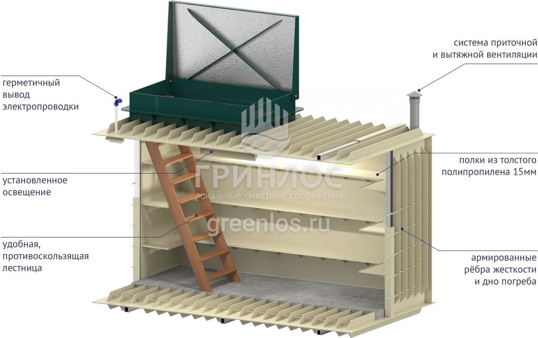 «ГРИНЛОС Погреб» представляет собой заглубленное герметичное техническое помещение габаритами 3.5х1.5х2 м. Устройство поставляется в полной заводской готовности для круглогодичного хранения продуктов питания – овощей, солений и др. домашних запасов.