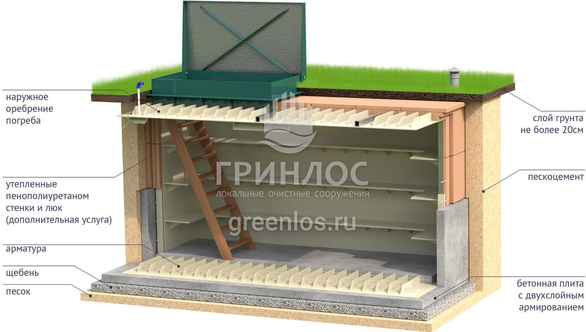 «ГРИНЛОС Погреб» представляет собой заглубленное герметичное техническое помещение габаритами 4х2х2 м. Устройство поставляется в полной заводской готовности для круглогодичного хранения продуктов питания – овощей, солений и др. домашних запасов.