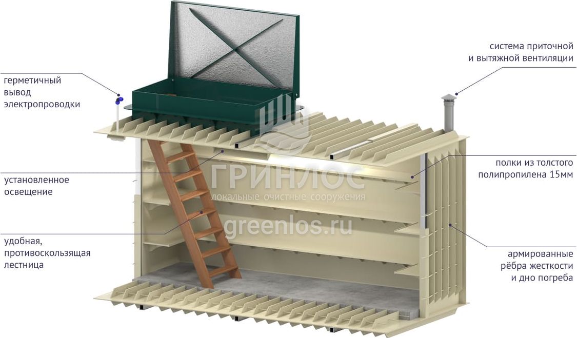 Для функциональной эксплуатации Гринлос Погреб Погреб ЛК 4000*2000*2000 оборудован приточной и вытяжной вентиляцией, освещением, полками, лестницей, крышкой.