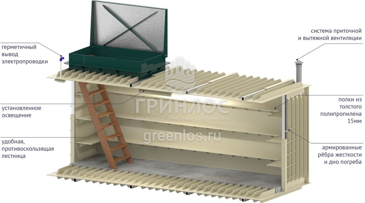 «ГРИНЛОС Погреб» представляет собой заглубленное герметичное техническое помещение габаритами 5х1.5х2 м. Устройство поставляется в полной заводской готовности для круглогодичного хранения продуктов питания – овощей, солений и др. домашних запасов.