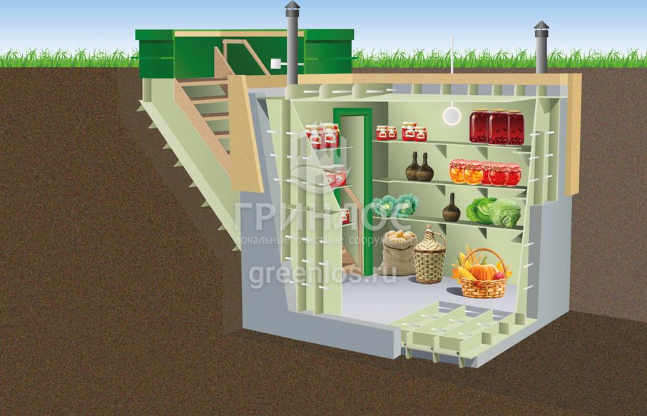 «ГРИНЛОС Погреб» представляет собой заглубленное герметичное техническое помещение габаритами 3х1.5х2 м. Устройство поставляется в полной заводской готовности для круглогодичного хранения продуктов питания – овощей, солений и др. домашних запасов.