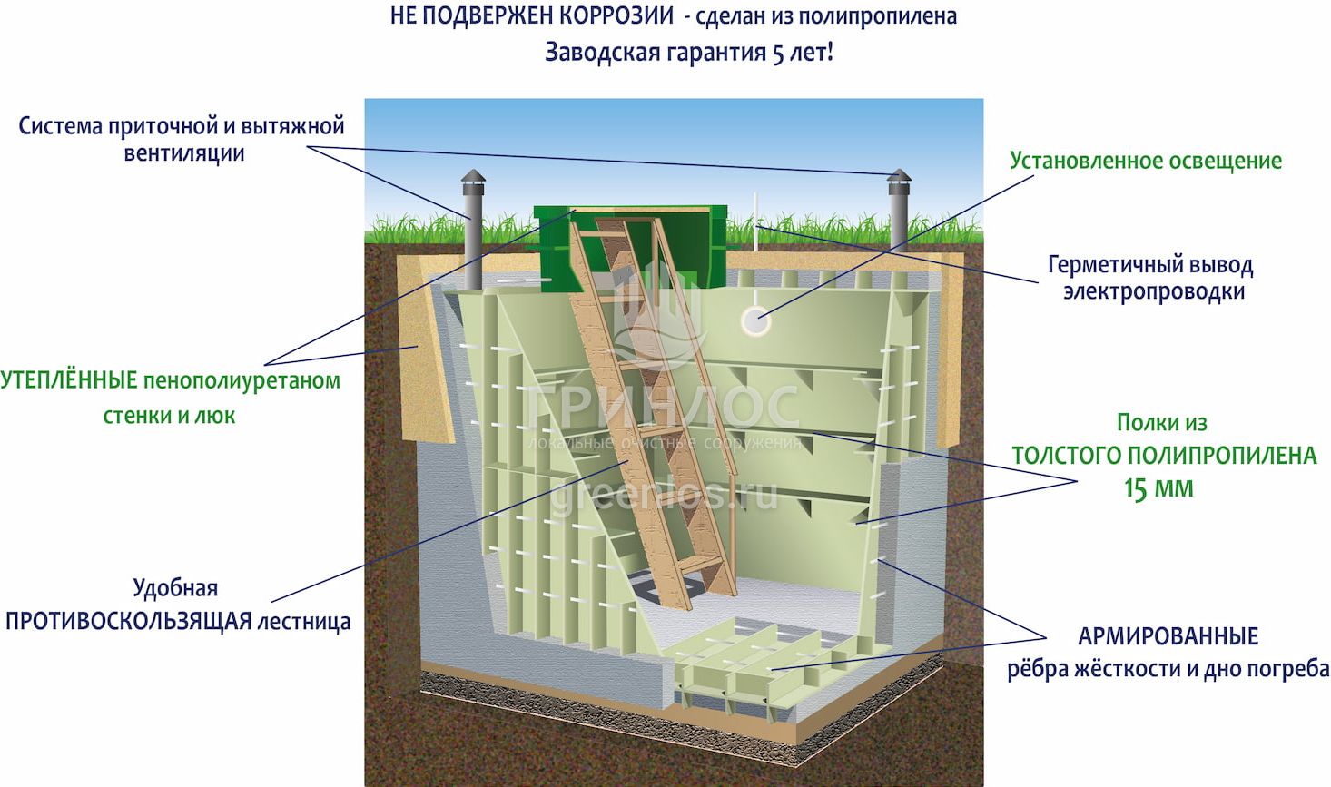 Материал изготовления погреба – пищевой полипропилен блок-сополимер, который является экологичным материалом, абсолютно безвредным для продуктов питания, здоровья человека и домашних животных. Полипропилен не поддается коррозии и гниению, обеспечивает герметичность конструкции.