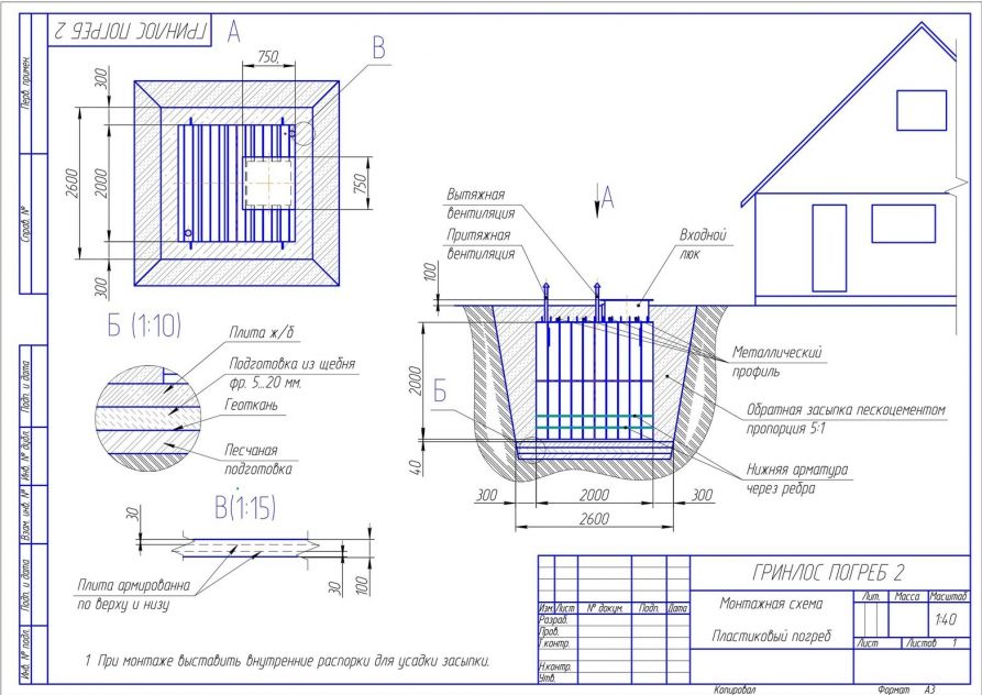 При условии уровня грунтовых вод выше 1500 мм от уровня земли, при наличии плывуна, при монтаже в скальных грунтах и прочих нестандартных ситуациях, а также при монтаже Гринлос Погреб ЛС 2000*2000*2000 под зданиями, сооружениями, любыми постройками и при организации пешеходной или проезжей зоны над Гринлос Погреб ЛС 2000*2000*2000, в случае заглубления Гринлос Погреб ЛС 2000*2000*2000 более чем на 250 мм от верхнего пластикового горизонтального перекрытия до запланированного после проведения финишного благоустройства уровня земли песчано-цементную смесь не-обходимо заменить бетоном, а непосредственно над верхним пластиковым горизонтальным перекрытием Гринлос Погреб ЛС 2000*2000*2000 необходимо смонтировать разгрузочную плиту, опирающуюся на бетонные стенки, возведенные по периметру устанавливаемого Гринлос Погреб ЛС 2000*2000*2000, опирающиеся на выпуск плиты основания. Расчет толщины и конструкции стен и разгрузочной плиты производит специализированная проектная организация исходя из предполагаемой нагрузки.