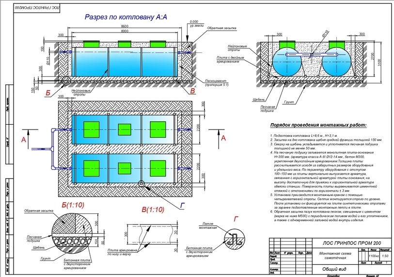 - Установка ГРИНЛОС Пром 200 Пр. Перед началом работ выполняется входной контроль качества, осмотр оборудования с целью обнаружения дефектов, полученных при транспортировке и хранении, с последующим подписанием акта передачи оборудования в монтаж. Так как станция имеет вес 1100 кг, установка производится монтажным краном, с помощью четырехветвевой стропы. Септик монтируется строго по уровню. После установки он фиксируется на плите синтетическими стропами за заранее подготовленные монтажные петли в плите.