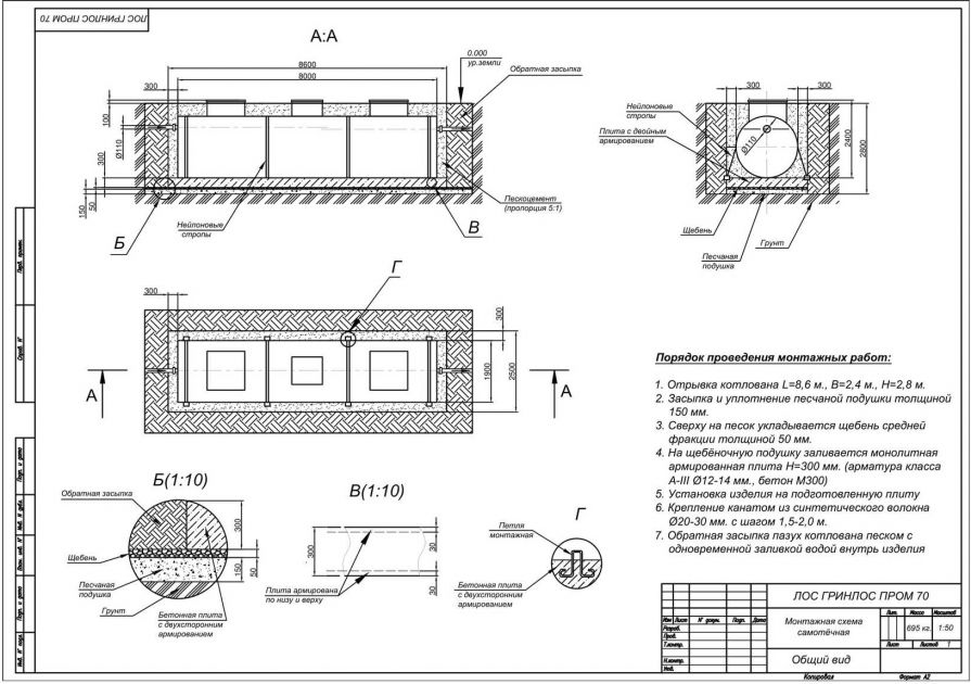 - Установка ГРИНЛОС Пром 70 Пр. Перед началом работ выполняется входной контроль качества, осмотр оборудования с целью обнаружения дефектов, полученных при транспортировке и хранении, с последующим подписанием акта передачи оборудования в монтаж. Так как станция имеет вес 695 кг, установка производится монтажным краном, с помощью четырехветвевой стропы. Септик монтируется строго по уровню. После установки он фиксируется на плите синтетическими стропами за заранее подготовленные монтажные петли в плите.