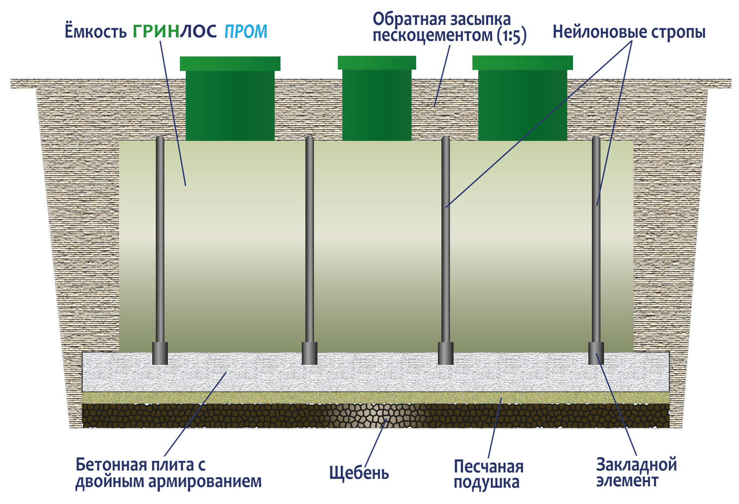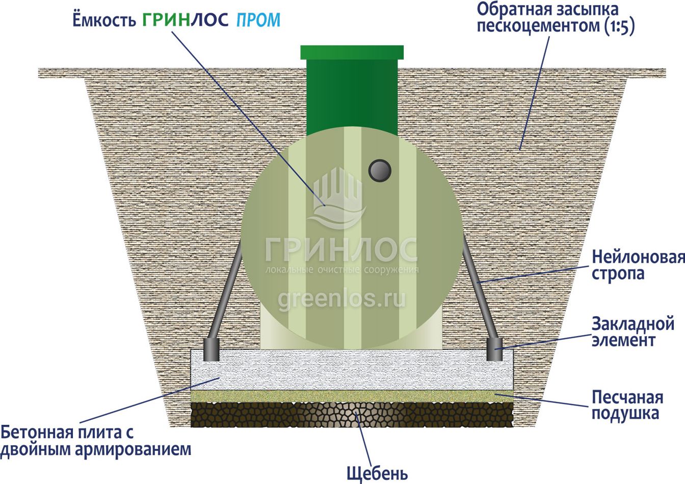 - Обратная засыпка (бетонирование). При заглублении септика на глубину не более 250 мм от верхнего пластикового горизонтального перекрытия до запланированного уровня земли, в однородных грунтах с низким уровнем вод обратную обсыпку допустимо производить песком смешанным с цементом (марка не ниже М500). Соотношение цемента и песка для обсыпки составляет 1:5. Песчано-цементная засыпка производится послойно, с обязательным трамбованием и проливкой водой каждого слоя. Толщина каждого слоя 300 мм. При условии уровня грунтовых вод выше 1500 мм от уровня земли, при наличии плывуна, скальных грунтов и прочих нестандартных ситуациях, а также в случае заглубления ГРИНЛОС Пром 80 Пр более чем на 250 мм песчано-цементную смесь необходимо заменить бетоном. Одновременно с засыпкой септика он заполняется водой, уровень воды должен превышать уровень засыпки (бетонирования) не менее чем на 200 мм и не более чем на 500 мм.