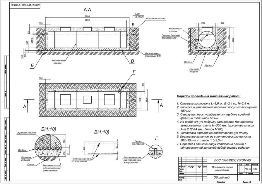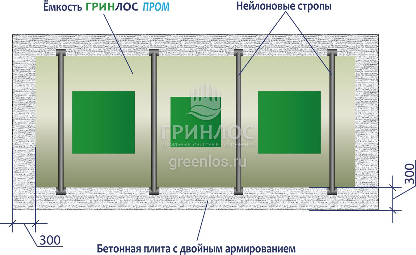 - Установка ГРИНЛОС Пром 80 Пр. Перед началом работ выполняется входной контроль качества, осмотр оборудования с целью обнаружения дефектов, полученных при транспортировке и хранении, с последующим подписанием акта передачи оборудования в монтаж. Так как станция имеет вес 740 кг, установка производится монтажным краном, с помощью четырехветвевой стропы. Септик монтируется строго по уровню. После установки он фиксируется на плите синтетическими стропами за заранее подготовленные монтажные петли в плите.