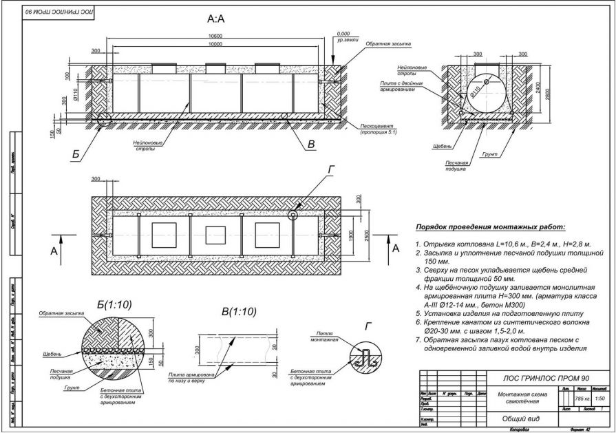 - Установка ГРИНЛОС Пром 90 Пр. Перед началом работ выполняется входной контроль качества, осмотр оборудования с целью обнаружения дефектов, полученных при транспортировке и хранении, с последующим подписанием акта передачи оборудования в монтаж. Так как станция имеет вес 785 кг, установка производится монтажным краном, с помощью четырехветвевой стропы. Септик монтируется строго по уровню. После установки он фиксируется на плите синтетическими стропами за заранее подготовленные монтажные петли в плите.