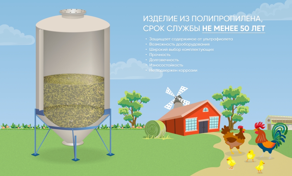 Силос стойко переносит механические воздействия, любые погодные условия, а также воздействия, оказываемые химически агрессивными веществами.