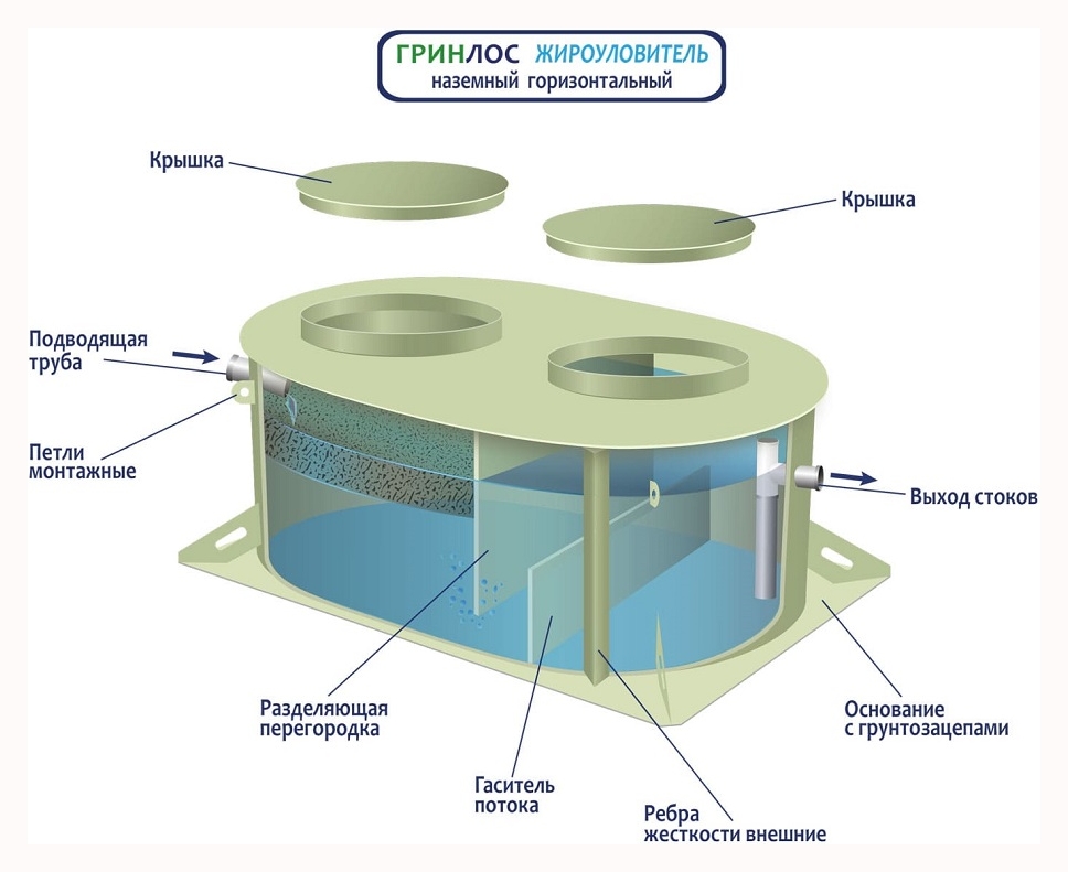 Жироуловители ГРИНЛОС представляют собой герметичную конструкцию, которая внутри разделена на камеры, где происходит отделение жира от воды. Поскольку удельный вес жира меньше веса воды, он скапливается в верхней части водного слоя, а переработанная вода через технологический перелив уходит в канализацию.
