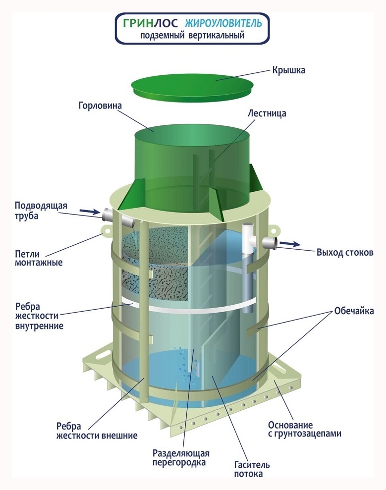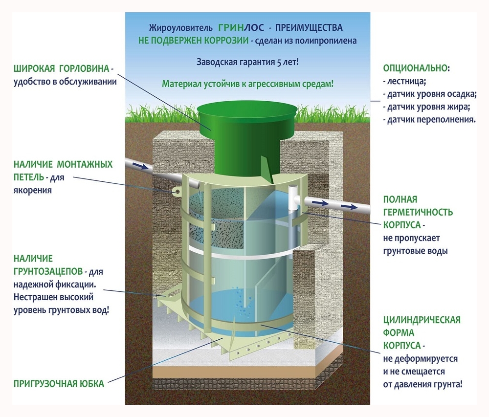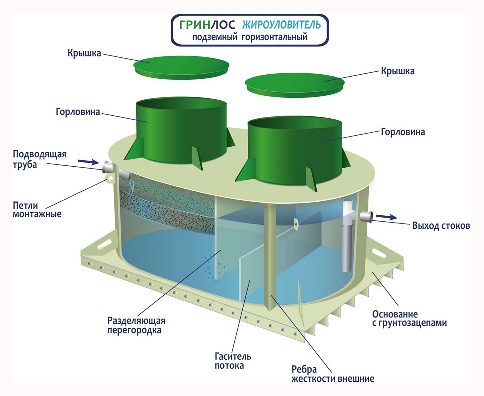 ГРИНЛОС Жироуловители бывают бытовыми и промышленными. Для бытовых условий берут конструкции, обслуживающие небольшие объемы сточных сбросов в канализацию. Содержание такого оборудования, несмотря на простоту использования и обслуживания, требует повышенной строгости и более частой ассенизации.