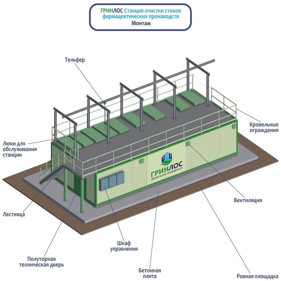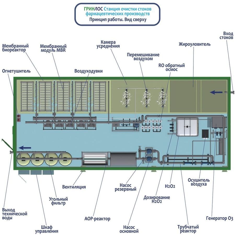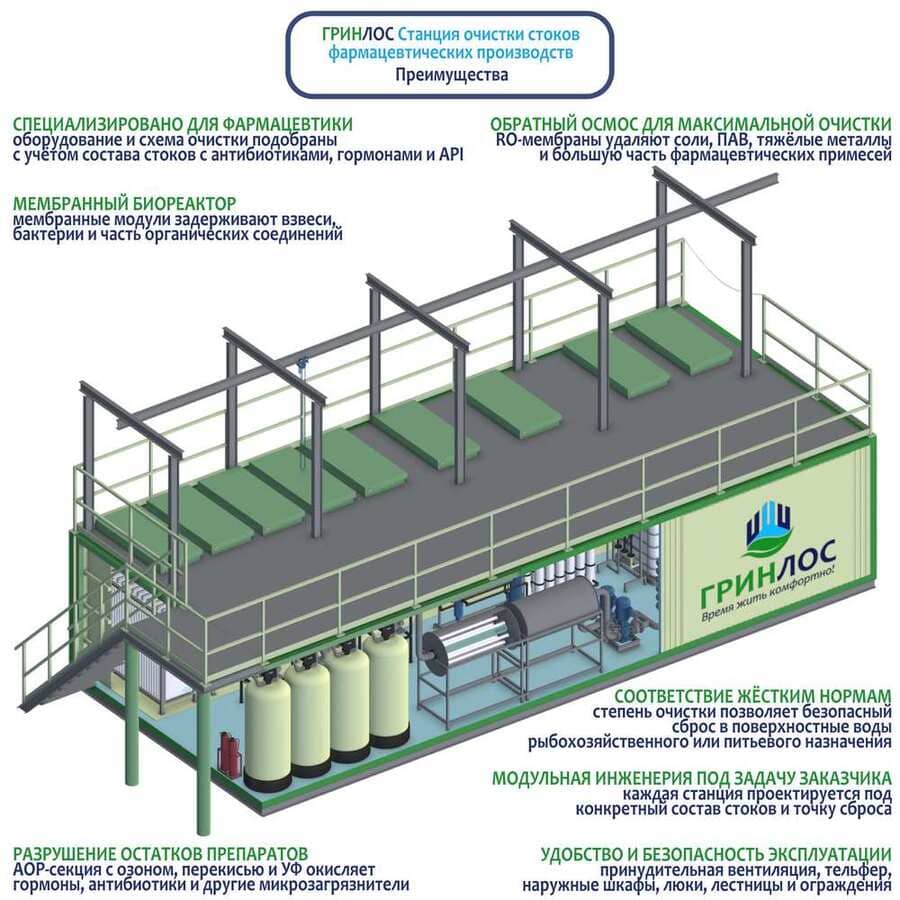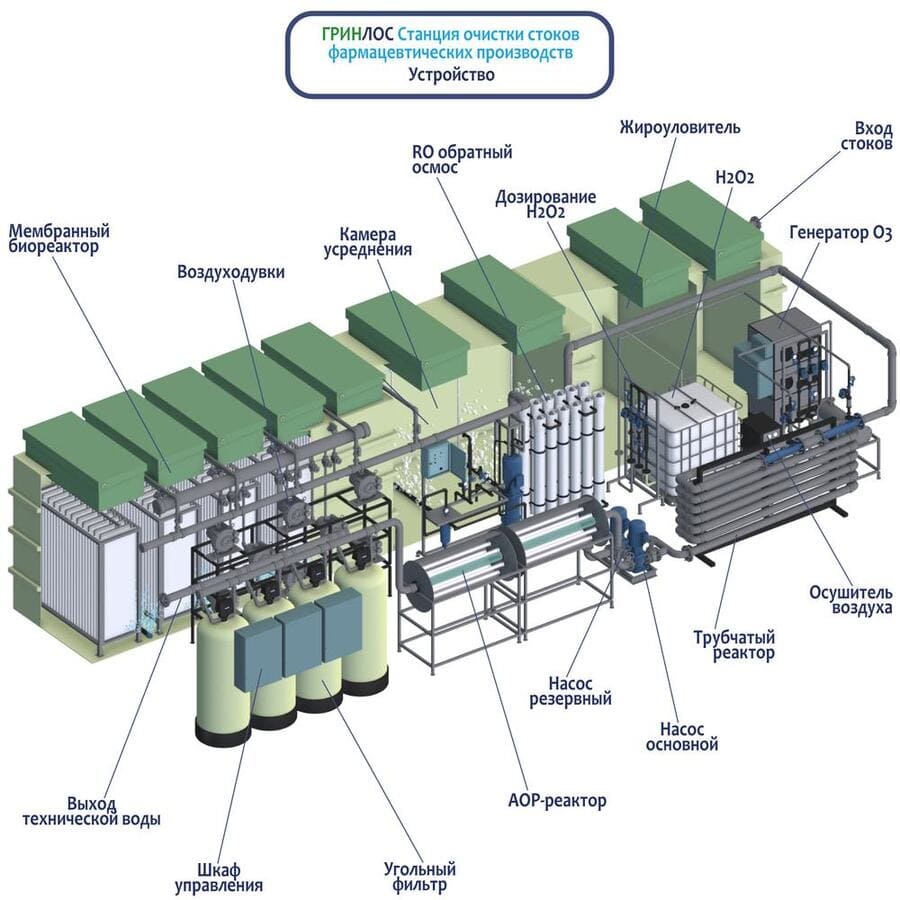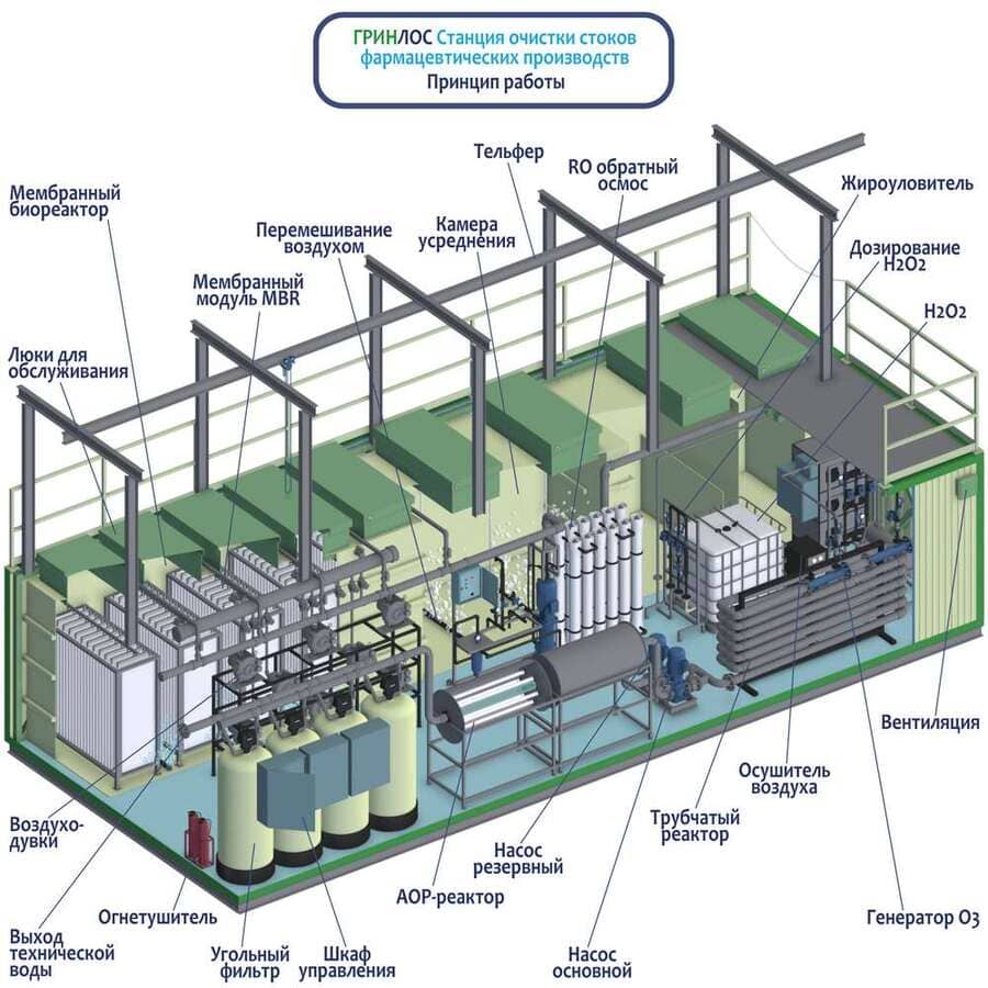Очистная станция для фармацевтических предприятий включает в себя комплекс современных модулей, размещенных внутри одного блока: